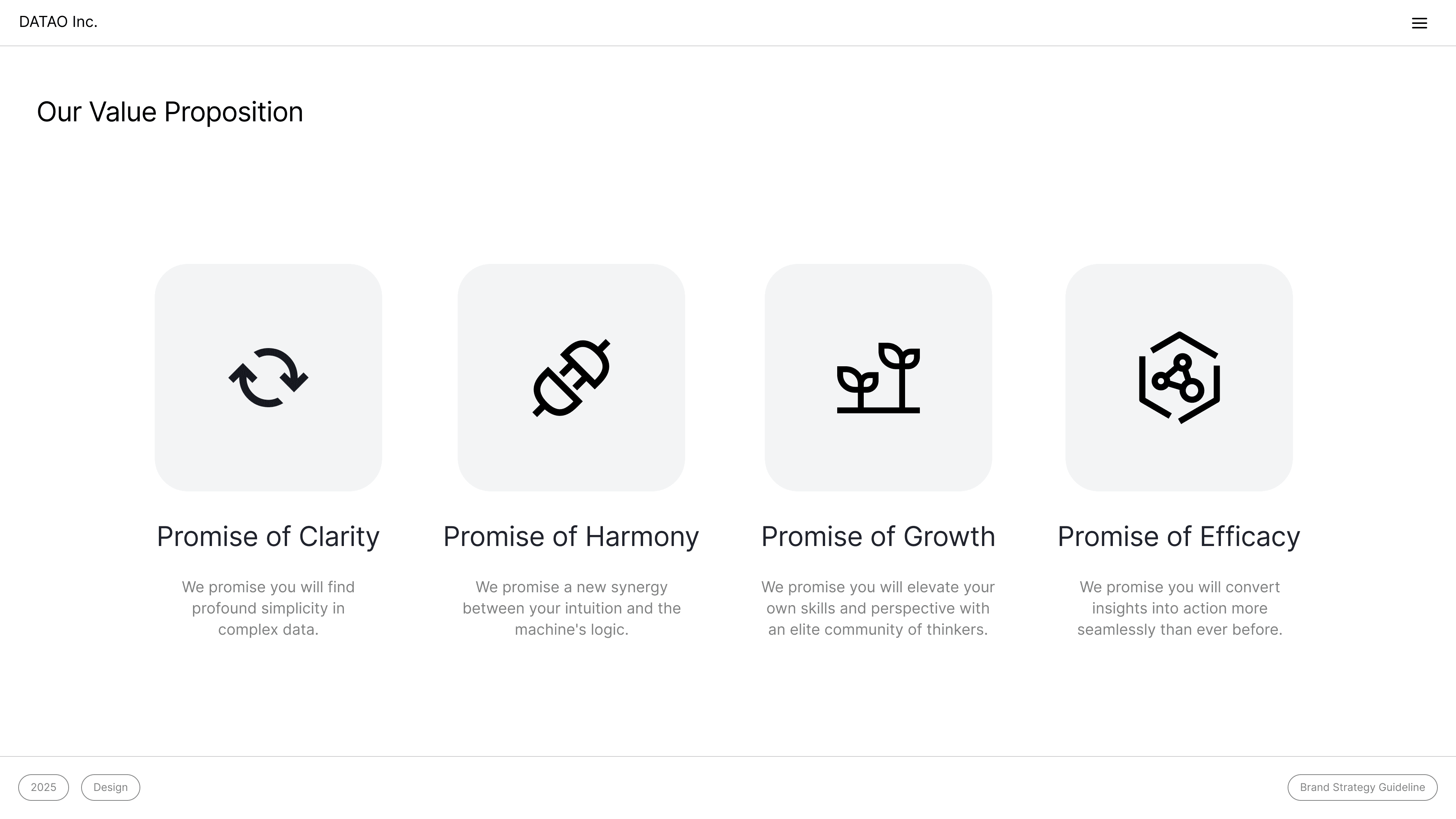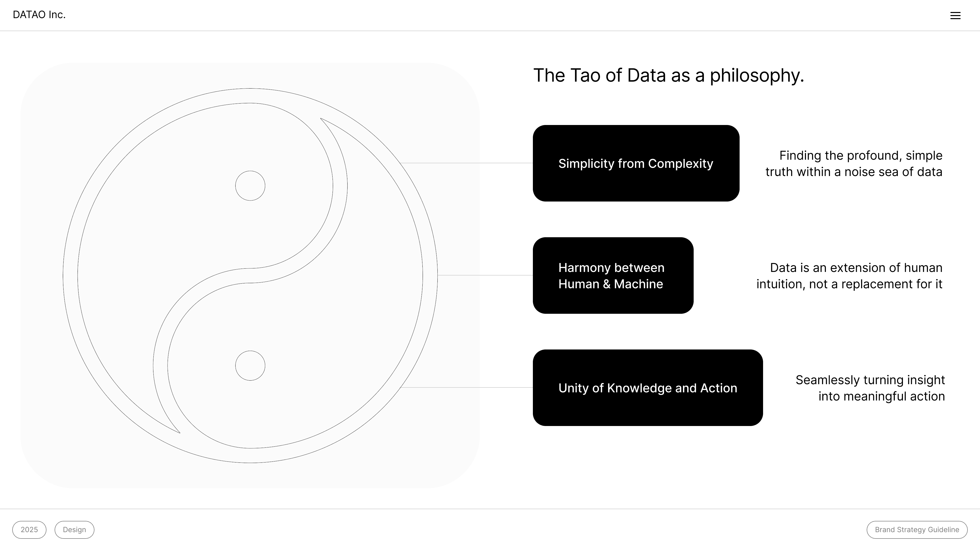 A complete strategic repositioning for DATAO, a company operating in a market drowning in data but starved of wisdom. The challenge was to elevate the brand from a mere analytics tool into a global intellectual community. We built the entire brand strategy around a central philosophy—'The Tao of Data'—a perspective that values unifying human intuition with machine logic. The result is a brand that doesn't just offer answers, but changes the way its users think, encapsulated by the tagline: 'think in data'.