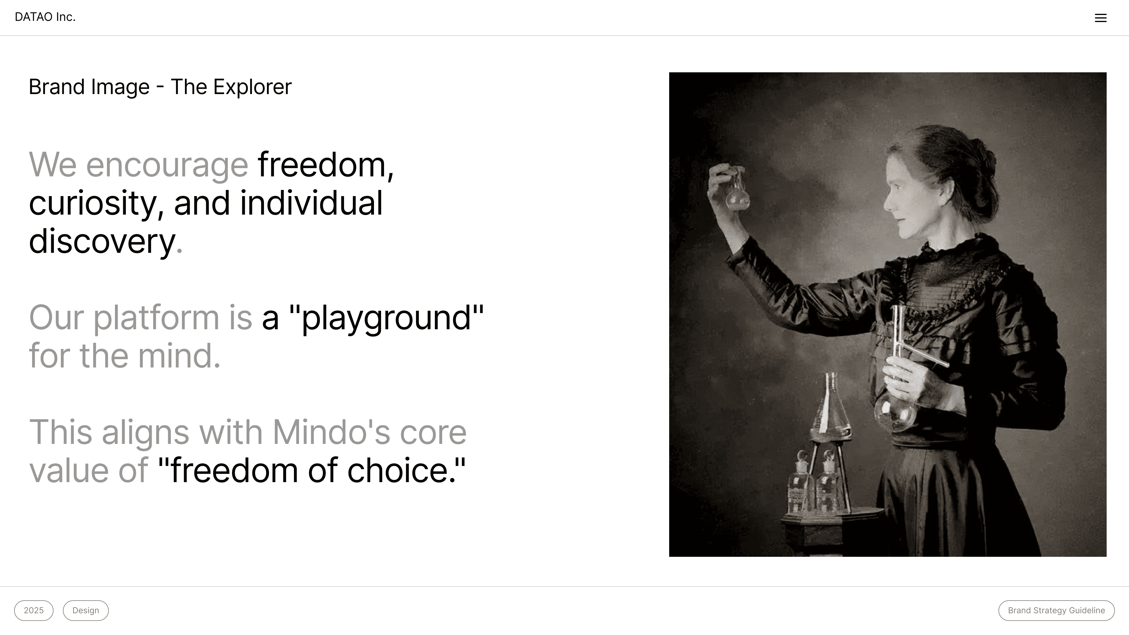 The brand's personality, or image, was then constructed to embody this philosophy and positioning. A dual-archetype approach was logically derived to capture the brand's unique value. The "Sage" archetype directly reflects the "Tao of Data" philosophy, promising wisdom, truth, and clarity in a chaotic environment. This is complemented by the "Explorer" archetype, which speaks to the user's desire for freedom, curiosity, and individual discovery within the platform. This combination is not contradictory; rather, it resolves a key tension by offering a guided path to wisdom while simultaneously providing a playground for the mind.