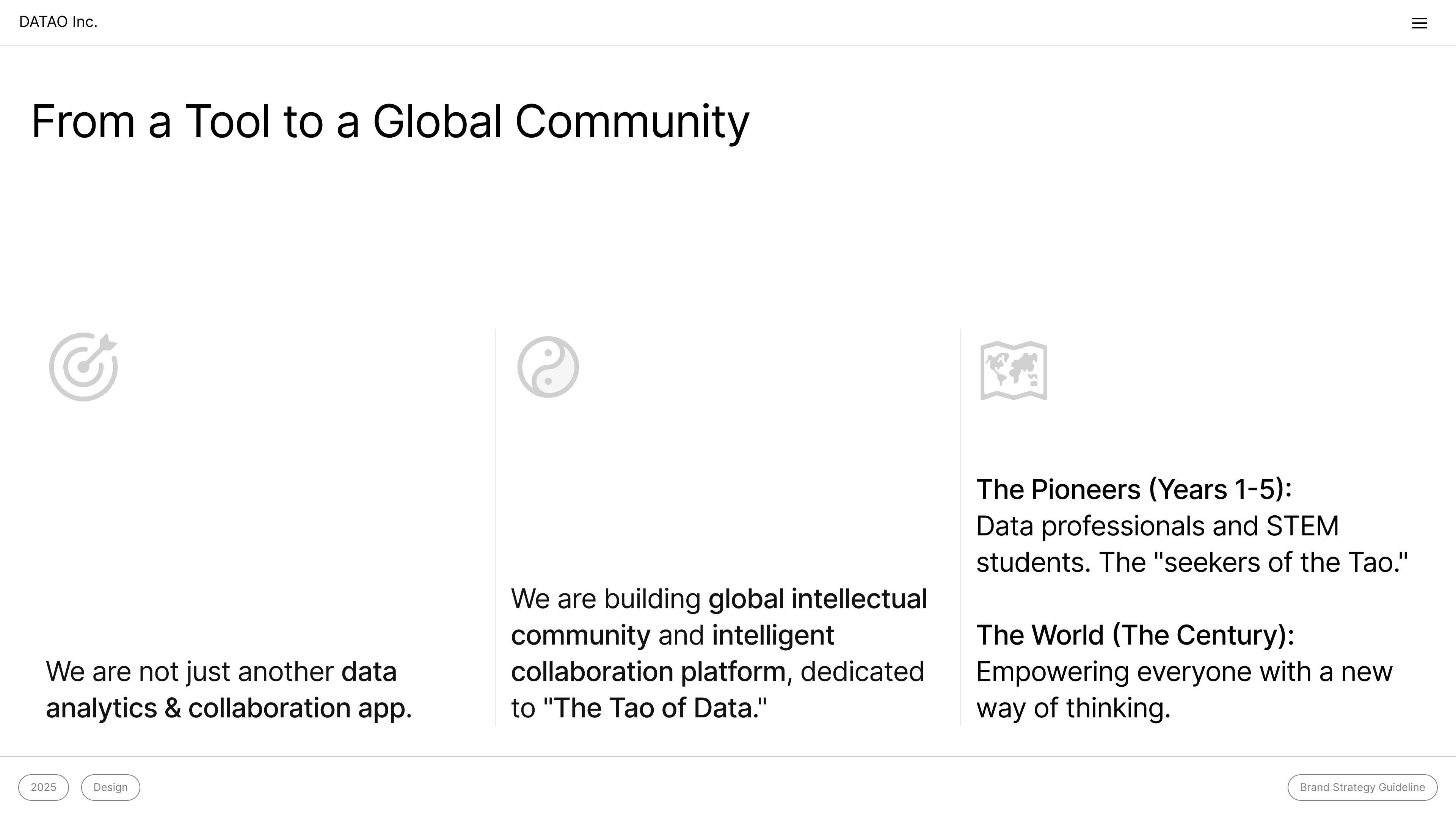 With this philosophy established, the brand's market positioning was defined. A logical progression dictated that DATAO should not be positioned as just another data analytics tool in a saturated market. Instead, its purpose is to cultivate a global intellectual community and intelligent collaboration platform. This positioning elevates the brand from a utility to a destination. The initial target audience—data professionals and STEM students—was selected strategically; as "seekers of the Tao," they are the most likely early adopters to validate the philosophy and build the foundation of the community. The long-term vision is to empower a broader audience, which is a logical extension of a successful initial adoption phase.